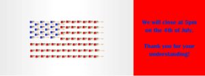 We will close at 5pm on Memorial Day, on the 4th of July, Labor Day, Christmas Eve and New Year’s Eve.